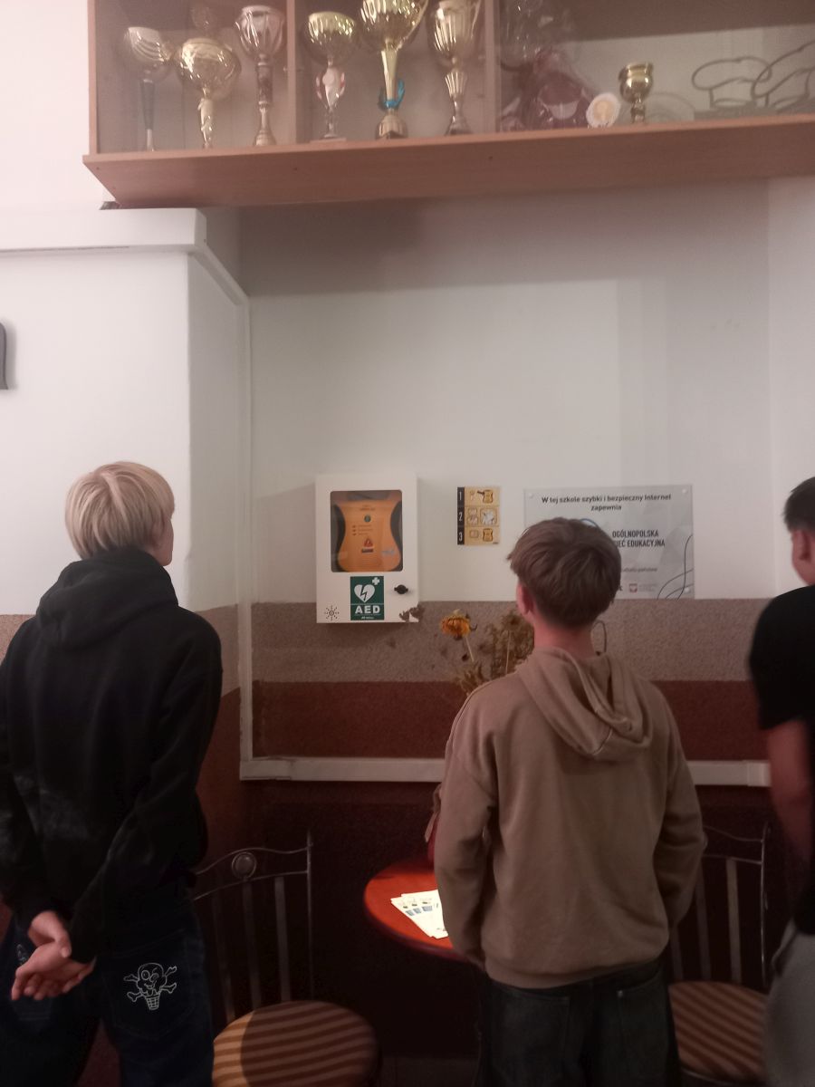 Uczniowie klas pierwszych podczas zajęć z EDB, zostali przeszkoleni w zakresie umiejętności korzystania z dróg ewakuacyjnych, poznali rozmieszczenie sprzętu gaśniczego oraz zasadę działania zamontowanego w szkole systemu oddymiania mechanicznego. Wskazane zostało im także miejsce AED oraz zapoznali się z informacjami zamieszczonymi w gablocie na drugim pietrze, gdzie w przyszłości będą mogli umieszczać materiały z zakresu pierwszej pomocy przedmedycznej, BHP i p.poż i prawa pracy.